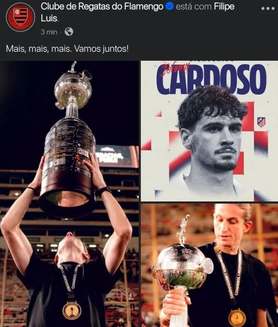 据《马卡报》报道,弗拉门戈官方社媒出现严重失误:在发布主帅菲利佩-路易斯续约公告时,错误附上了马竞中场约翰尼-卡多佐的照片,瞬间点燃转会谣言。
